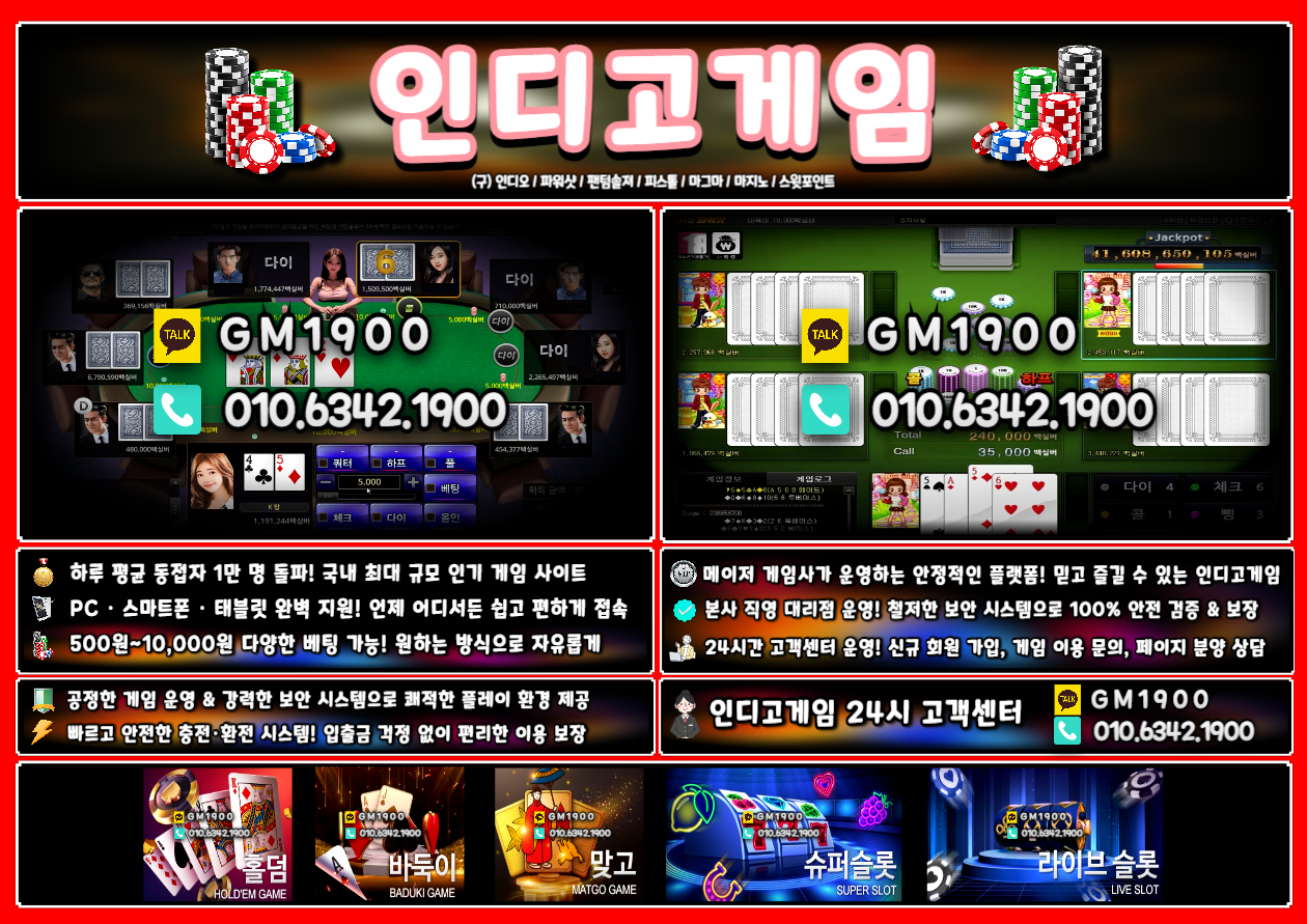 온라인 홀덤, 바둑이, 맞고, 슬롯 등 다양한 게임을 제공하며 국내 최고 인기를 자랑합니다.